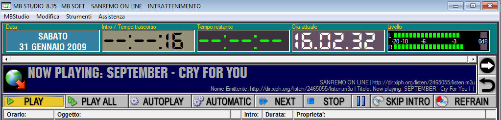 MB STUDIO is a radio automation software that will allow you to create and manage your own radio station playing all your media files: jingles, commercials, news, songs, Files from internet, live streams, live inputs from your sound card, satellite feeds. Automatically download news and shows from Internet. Multiple overlapping files and/or live sources (mic, line, aux). Voice tracking. Integrated CD Ripper. Integrated jukebox to play songs requested via sms / email messages. Display current playlist on your web site.
