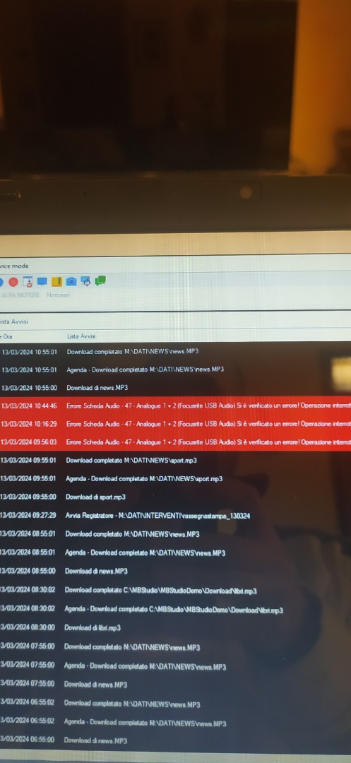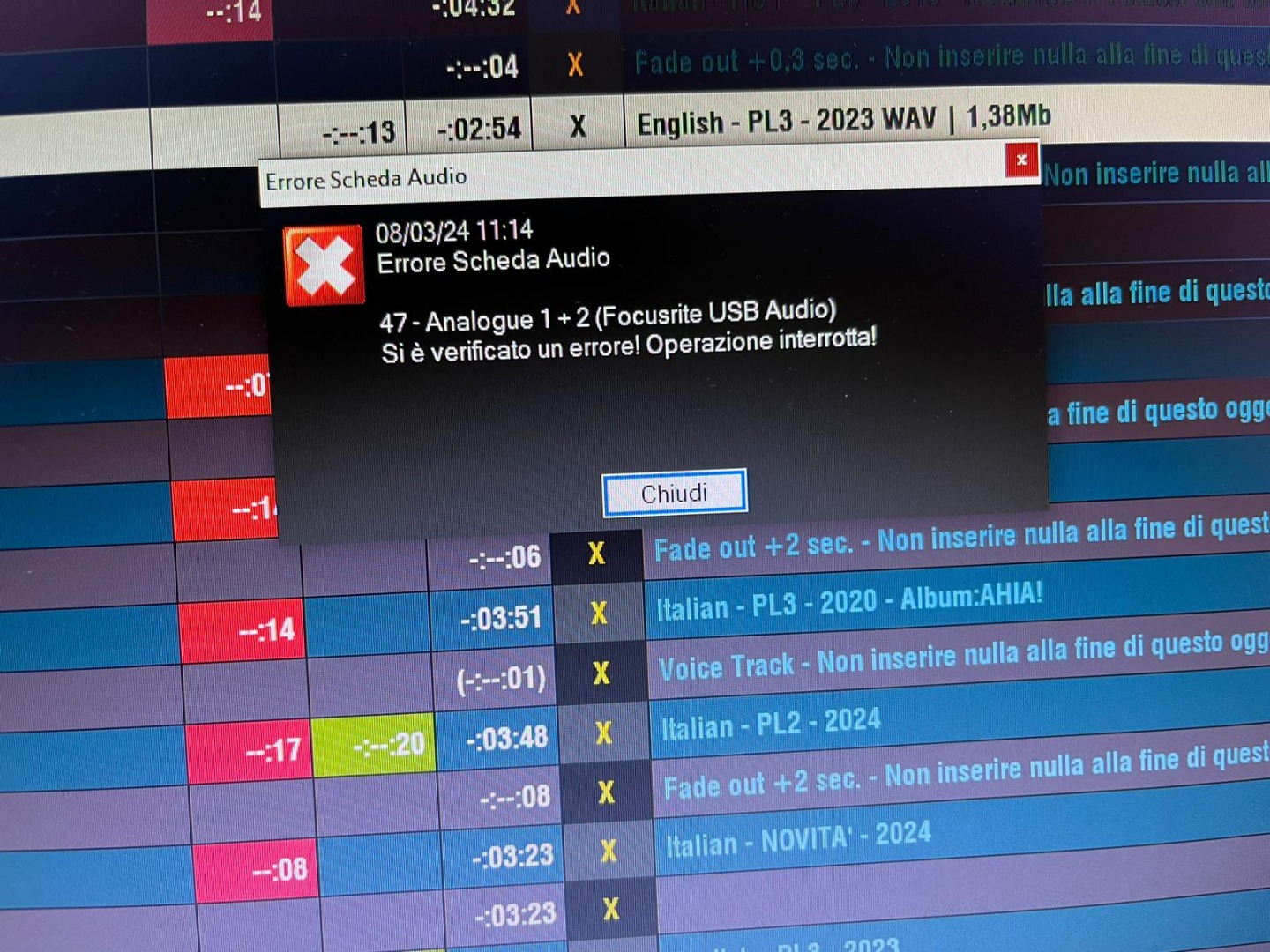ogni tanto abbiamo un problema con il tasto parla di MB studio, spesso durante l'utilizzo il software si blocca e appare il messaggio "Errore scheda audio. 47 Analogue 1+2 (Focusrite USB audio). Si è verificato un errore. Operazione interrotta."
