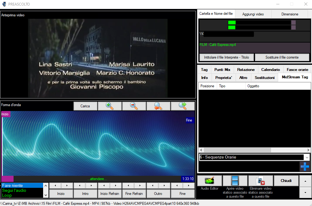 Puoi usare il preascolto con finestra compatta, cosi' la forma d'onda non viene utilizzata, ti basta cliccare su + per aggiungere un midstreamtag e cliccare sulla casella posizione per modificarla con la tastiera