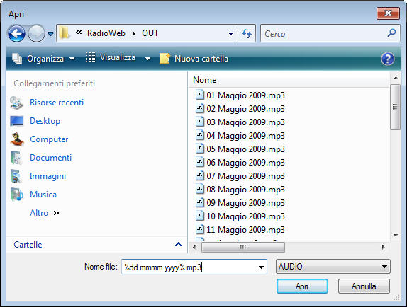 Molto probabilmente tu hai dei files audio, ognuno dei quali è nominato con la data di messa in onda e allora ti basta inserirlo come File standard senza dimenticare l'estensione, come in questo esempio: