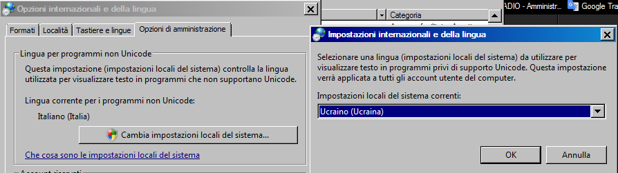 Nelle impostazioni internazionali vai in opzioni di amministrazione e cambia la lingua non unicode da italiano ad ucraino