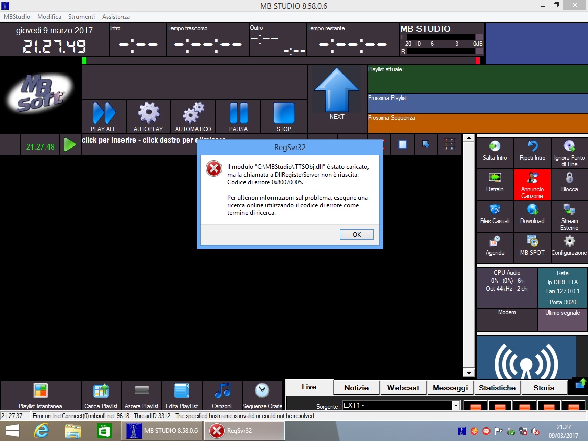 Il problema è causato dall'impossibilita' di MB STUDIO di scrivere nel registro di Windows. Hai modificato anche questo parametro?