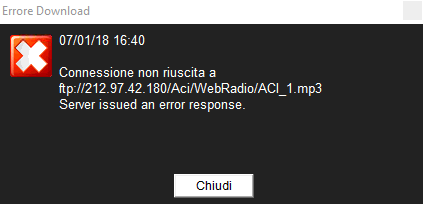 Stiamo provando a configurare lo scaricamento di un file audio via ftp (non passivo) su una nuova workstation con Win 10 Pro e MB Studio 8.59.4.2; lo scaricamento non è possibile neanche impostando il parametro opzionale --no-passive-ftp e otteniamo sempre lo stesso messaggio di errore come nell'immagine allegata: