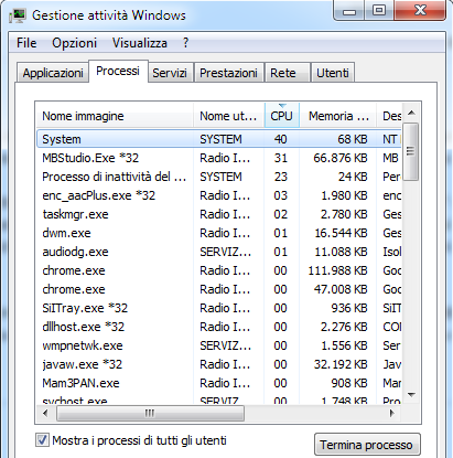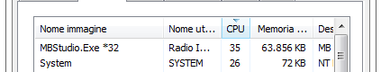 Ma la cosa più strana (ma ahimè verificata) è che in parallelo all'eseguibile di MBStudio, Task Manager vede un altro processo denominato "System" che arriva a consumare da solo anche oltre il 40% di CPU! E cosa ancora più strana è che questo processo si apre e si chiude come apro e chiudo MBStudio! Così di botto siamo passati da un modesto 10-15% che mi permetteva tranquillamente di aprire qualche pagina web e controllare la posta, ad un tremendo 75% che mi paralizza il pc e non mi permette praticamente di fare alcuna altra cosa.