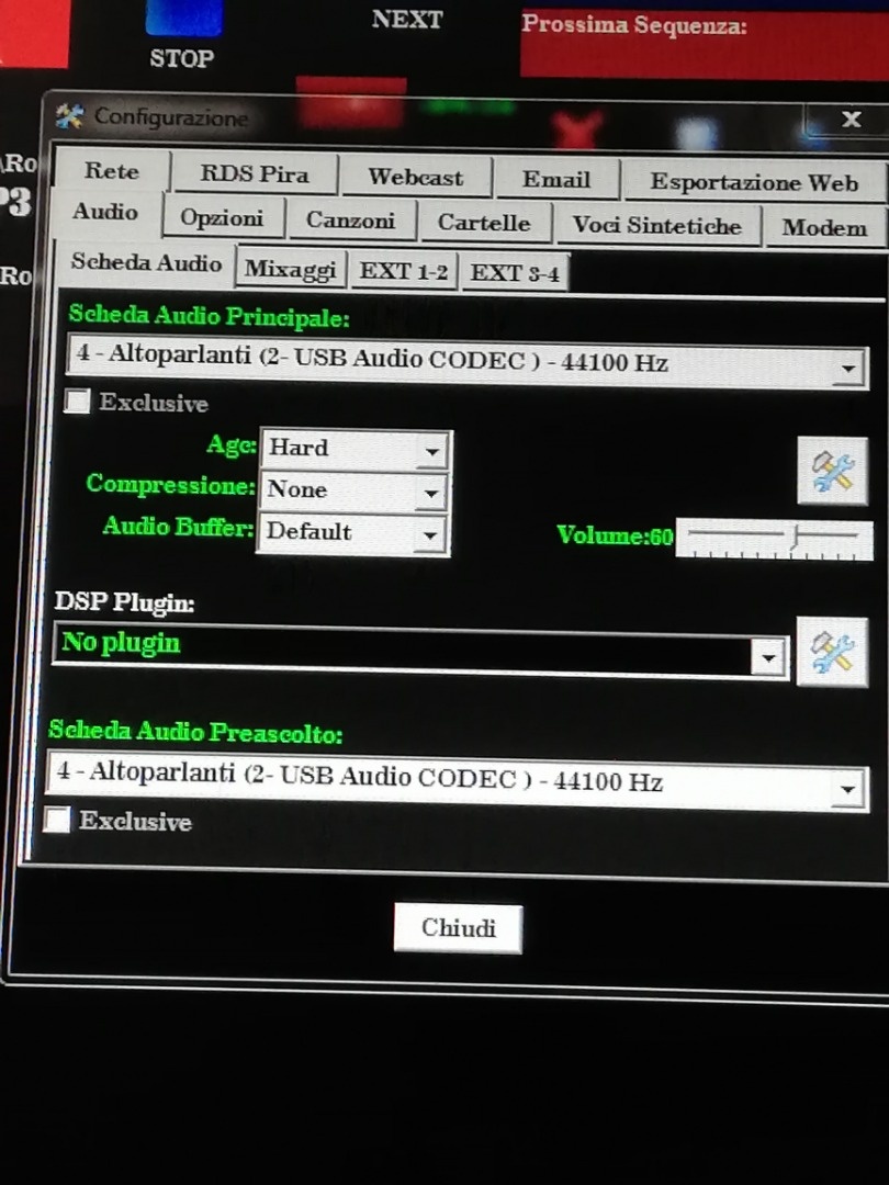 dunque clicca il sottostante pulsante di "Configurazione" e poi cambia il settaggio del selettore rosso e scegli quella scheda ma senza la scritta laterale (loopback). Inoltre NON attivare Exclusive.