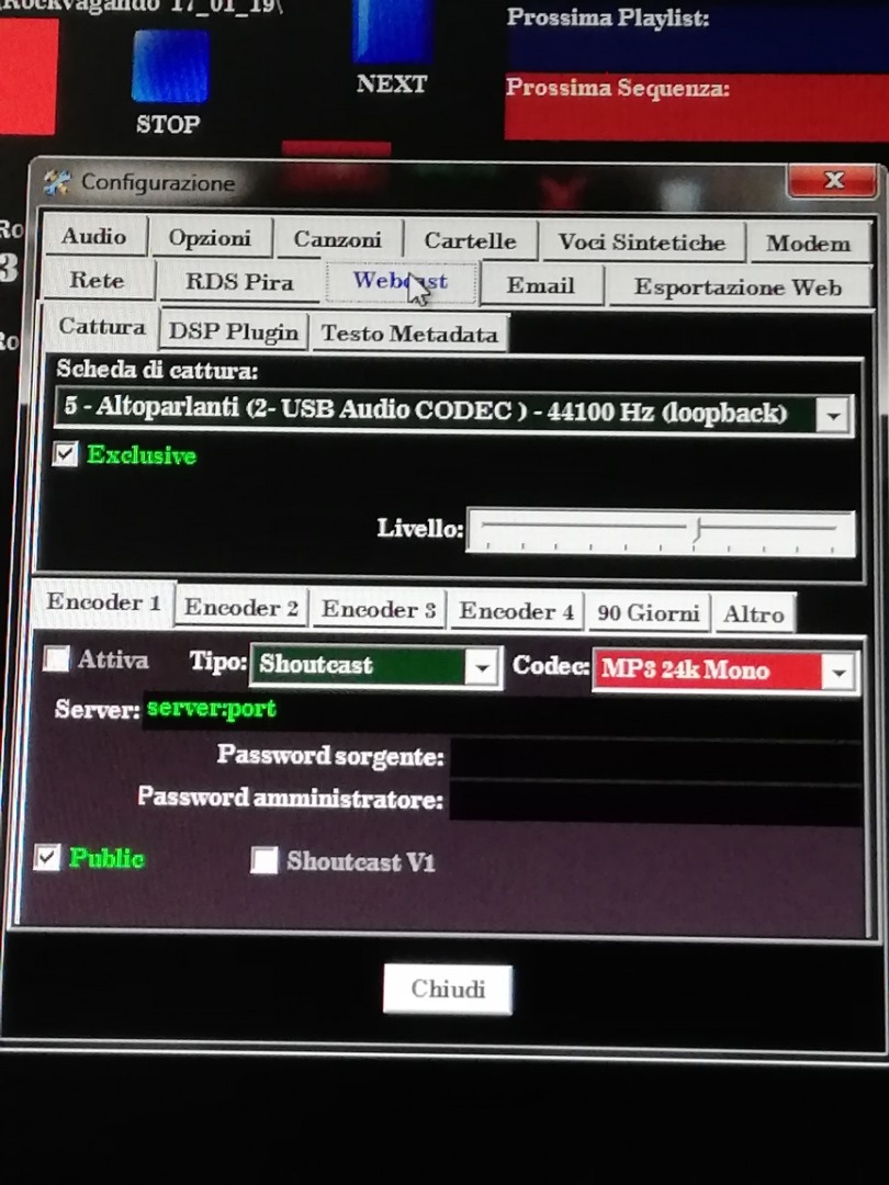 L'errore sta in MB STUDIO\Configurazione\Webcast\Cattura li' hai impostato una cattura (loopback) e cio' è un grave errore.
