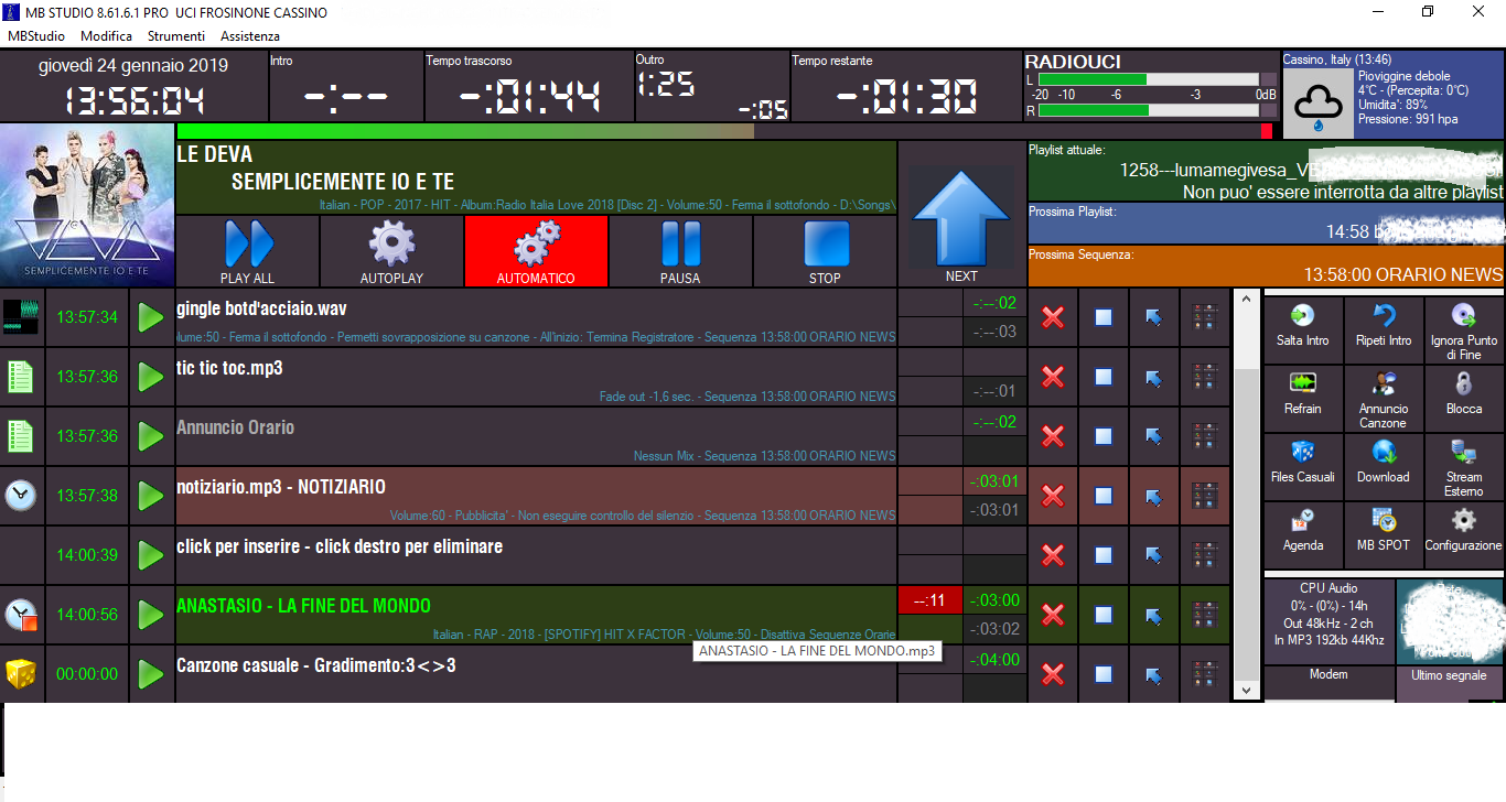 MB STUDIO is a radio automation software that will allow you to create and manage your own radio station playing all your media files: jingles, commercials, news, songs, Files from internet, live streams, live inputs from your sound card, satellite feeds. Automatically download news and shows from Internet. Multiple overlapping files and/or live sources (mic, line, aux). Voice tracking. Integrated CD Ripper. Integrated jukebox to play songs requested via sms / email messages. Display current playlist on your web site.