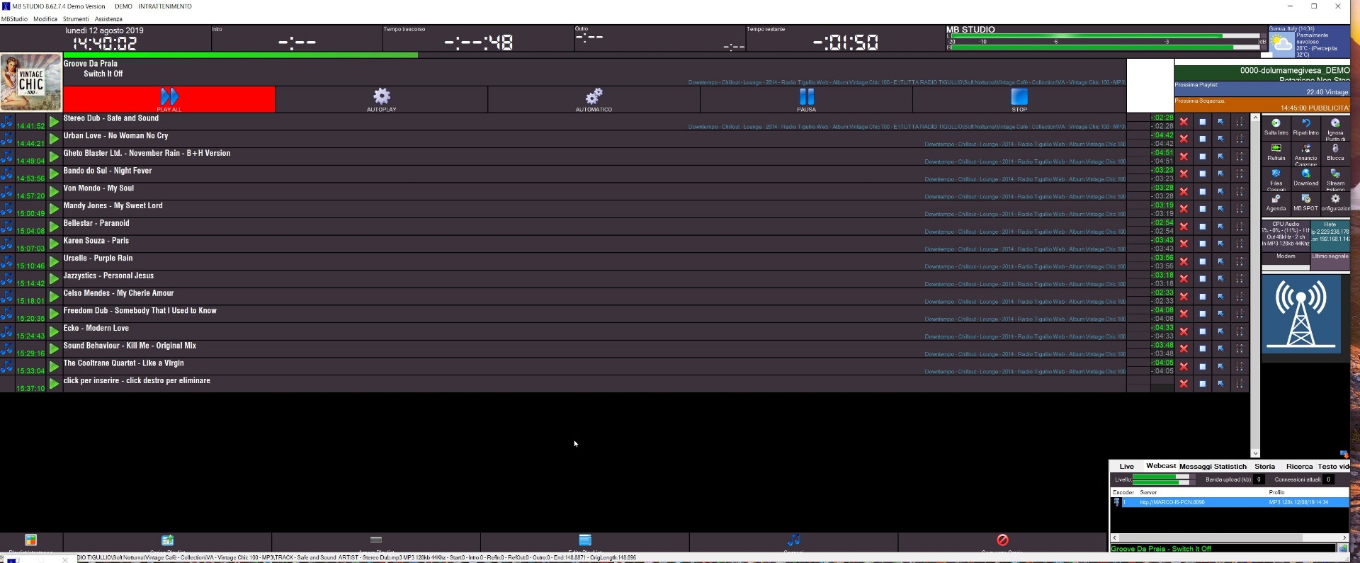 MB STUDIO is a radio automation software that will allow you to create and manage your own radio station playing all your media files: jingles, commercials, news, songs, Files from internet, live streams, live inputs from your sound card, satellite feeds. Automatically download news and shows from Internet. Multiple overlapping files and/or live sources (mic, line, aux). Voice tracking. Integrated CD Ripper. Integrated jukebox to play songs requested via sms / email messages. Display current playlist on your web site.
