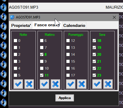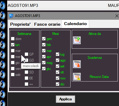 e se volessi che il file Agosto.mp3, così come tutti gli altri in rotazione, andasse oggi per tutte e due le sequenze?