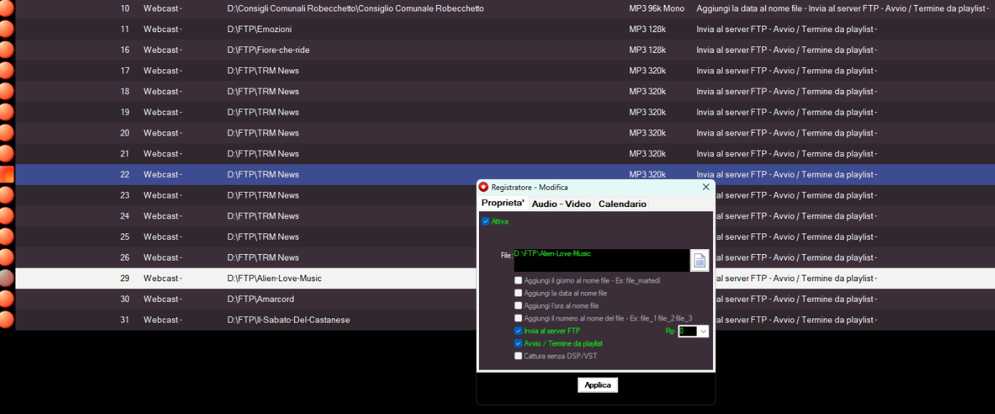 Scusa non capisco, io ho una cartella dove appoggio il programma che va in onda (Amarcord.wav) e una cartella dove appoggio il programma che viene spedito all’ftp (Amarcord.mp3) il registratore punta sulla cartella ftp perché cancella il file nella cartella midstream tag? E perché mi capita solo con quel file?