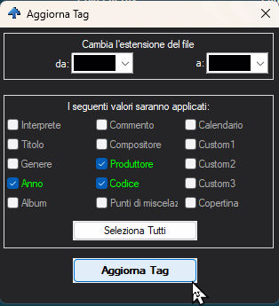 Quindi puoi usare una qualunque software di audio tag che ti sistemi l'archivio e poi puoi reimportare i tags desiderati con la funzione "Aggiorna Tag"