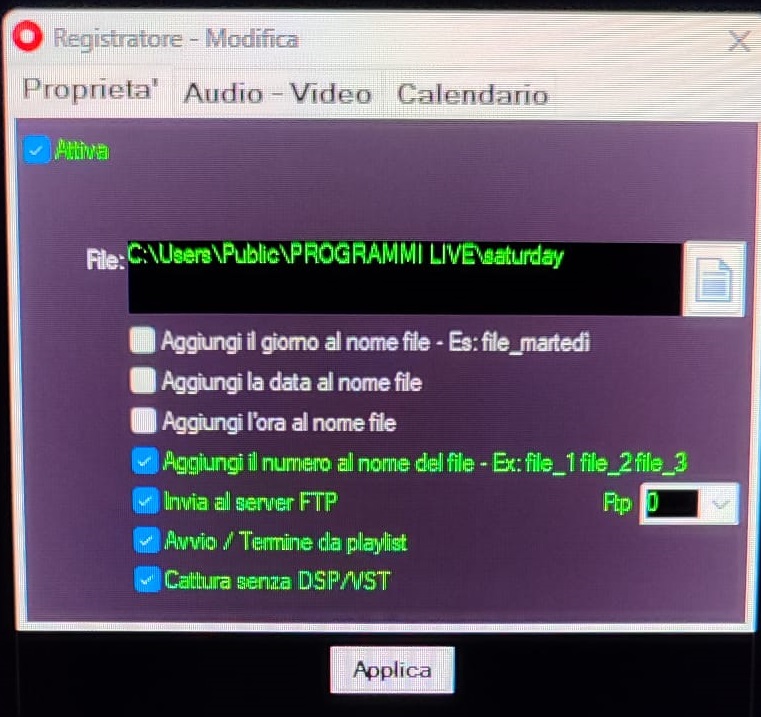 Salve, abbiamo l'ultima versione di MB STUDIO PRO , il registratore non si attiva in automatico perche ci siamo accorti che manca il settaggio ora di inizio e ora di fine